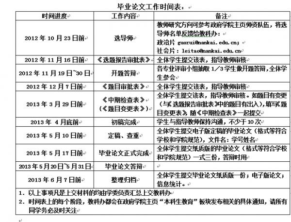 1. 员工应于2013年4月底在指导教师的指导和修改下完成论文初稿。5月10日前,应彻底完成定稿,学习委员收齐班级定稿的电子版(文件名:学号姓名,例:0815999张三)打包发送至guorui@nankai.edu.cn用于抄袭检测,相似度超过20%,需做出说明;一旦认定为抄袭,毕业论文成绩为零分,取消当年毕业资格。