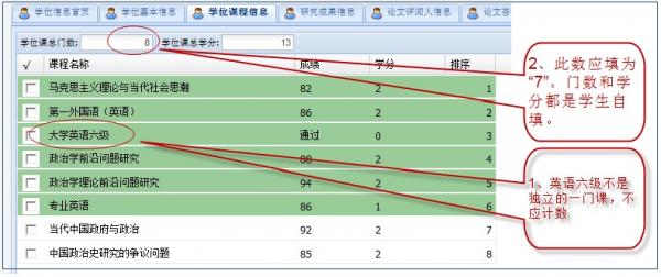 7、博士生在录入简况表时,对自己的课程数和学分数要自行填写,其中英语六级不计数:
