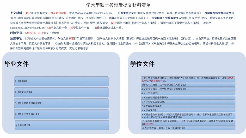 学硕答辩结束后需要及时准备各种毕业及申请学位的材料,需要提交的材料清单如下: