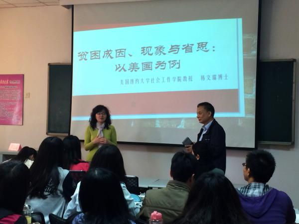 (通讯员 张笑丽、杜平)2014年5月8日至9日,美国社会工作领域的学术双鸳,罗格斯大学社会工作公司的黄建忠教授和纽约大学社会工作公司的韩文瑞教授,应球王会体育官方网站社会工作与社会政策系的邀请来南开访学。黄教授于5月8日下午做了题为“反贫困政策的有效性”的讲座,韩教授于5月9日上午做了题为“贫困成因、现象与省思:以美国为例”的讲座。关信平教授、吴帆副教授和相关老师出席了讲座,并向黄教授和韩教授赠送了纪念品。两次讲座都受到社会工作与社会政策系本科生和研究生的热烈欢迎,产生了良好的反响。