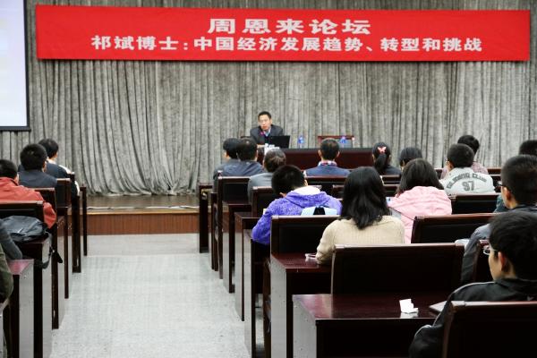 10月17日,中国证监会研究中心主任、北京证券期货研究院执行经理祁斌博士应邀做客“周恩来论坛”,做了题为“中国经济发展趋势、转型及挑战”的报告。活动由球王会经理吴志成教授主持。