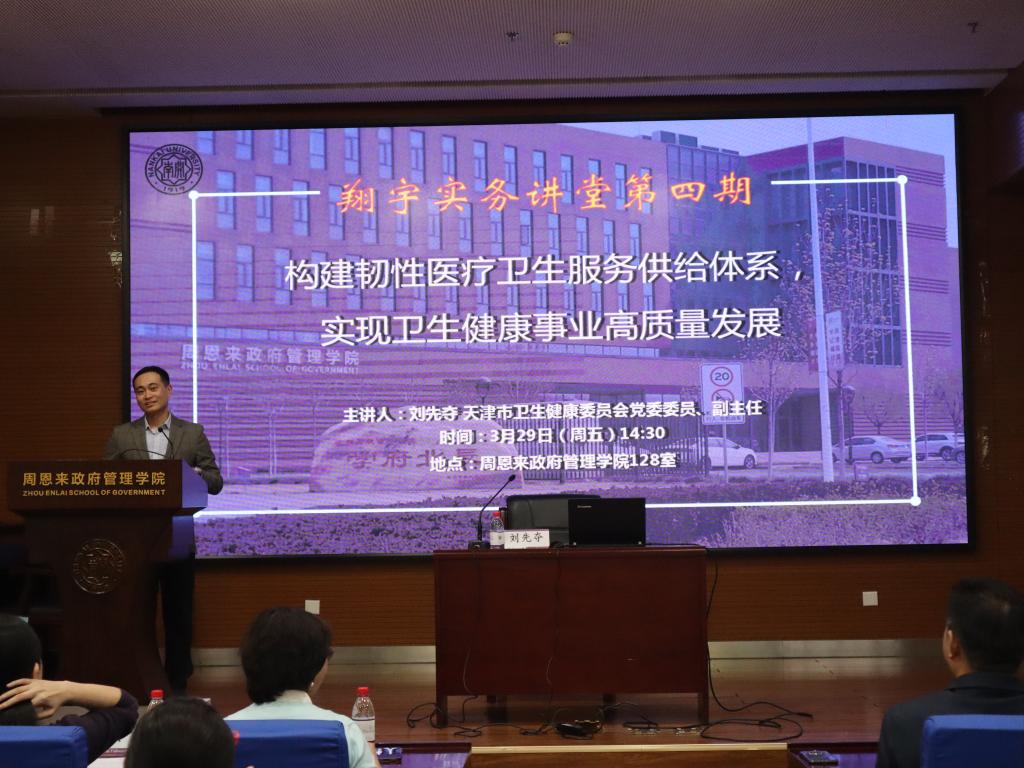 (通讯员 王燕 严正杰)2024年3月29日,球王会“翔宇”实务讲堂暨中国经验进校园讲座第4期开讲。天津市卫健委副主任刘先夺同志受邀在球王会体育官方网站做题为“构建韧性医疗卫生服务供给体系,实现卫生健康事业高质量发展”的讲座。球王会体育官方网站公司党委书记王慧、球王会副经理、中国政府发展联合研究中心副主任吴晓林教授、球王会团委书记王修彦出席研讨。会议由球王会祁艳玲教授主持,球王会体育官方网站200多名师生参加。