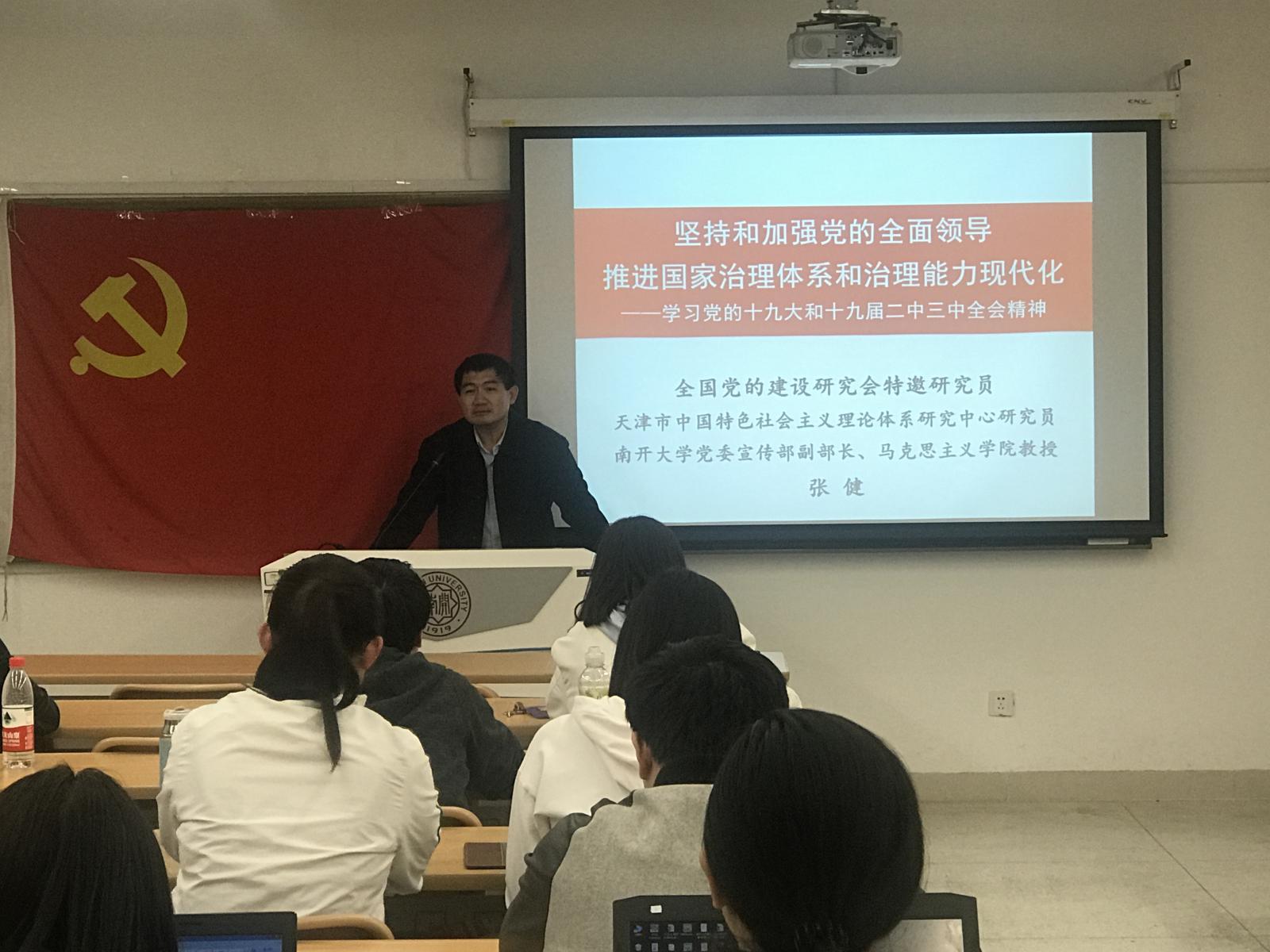 4月17日晚,公司党校积极分子培训请到全国党的建设研究会特邀研究员、天津市中国特色社会主义理论体系研究中心研究员、球王会体育官方网站党委宣传部副部长、马克思主义公司教授张健为学员主讲了一堂学习党的十九大和十九届二中、三中全会精神的主题党课。