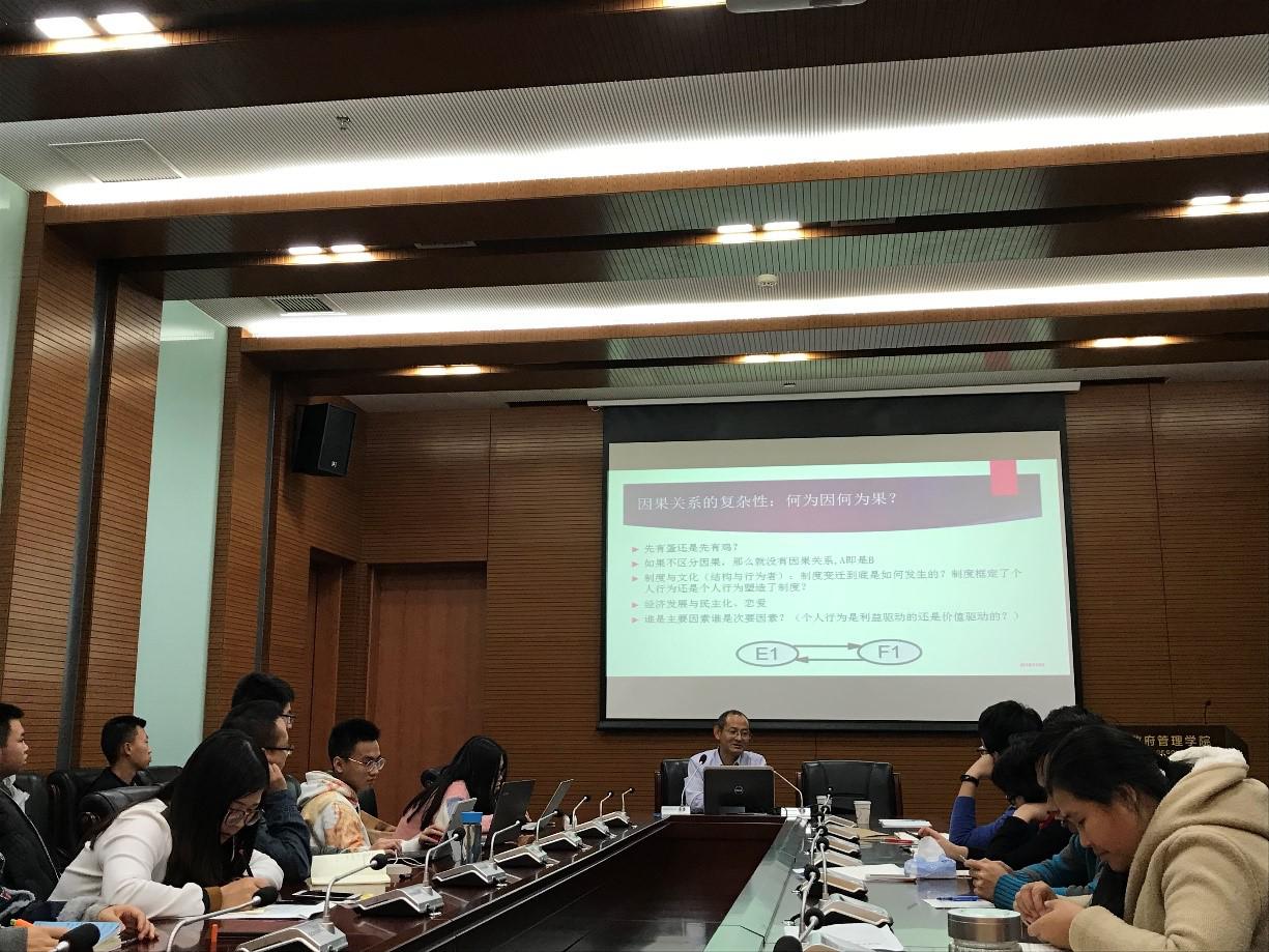 马得勇教授从社会科学的基本类型、理论的核心即因果关系、论文的类型等理论问题谈起。在此基础上,马得勇教授以“乡镇公推直选制度创新的兴亡”、“如何评估乡镇民主发展”两个案例为例,十分详尽地讲解了如何运用理论框架对现实问题进行分析以及如何进行定性研究,并以“政治传播为什么要重视个体层次的政治心理和政治态度的研究”为例,讲解了怎样进行定量研究。最后,马得勇教授总结,在做学术研究的时候,不要无谓地争论定性研究和定量研究两种方法的好坏,而要依研究对象选择合适的研究方法。无论是质性研究还是量化研究,都需要在大量阅读文献的基础上构建理论,并强调了阅读文献一定要有批判性思维。马得勇教授鼓励研究生同学走出校园、深入社会、了解现实,尽可能掌握更多的第一手资料;有平和的心态以及解决研究和调查中可能遇到的各种困难的灵活思维。