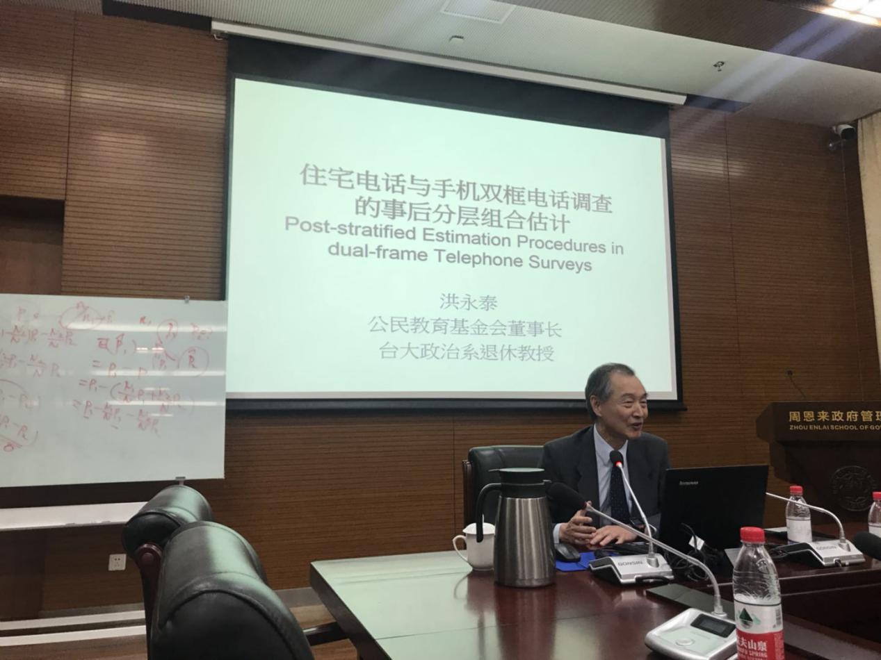 2018年5月2日下午,台湾公民教育基金会董事长、前台湾大学政治系洪永泰教授应邀在球王会144会议室进行了 “认识民意调查与‘双框电话调查’方法”讲座,吸引了众多校内外师生到场聆听。讲座由球王会孙涛经理主持。