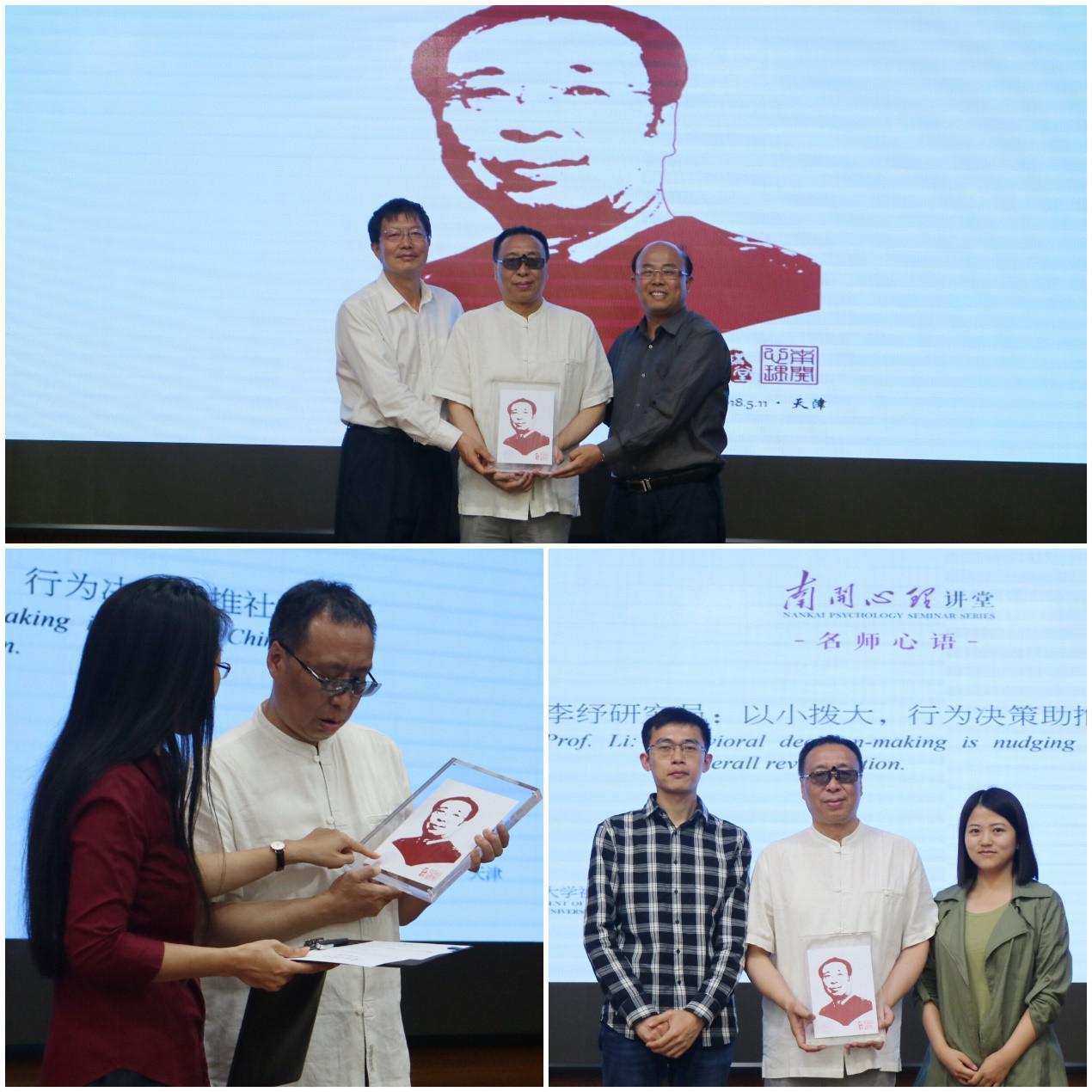 报告结束后,李纾与在座师生就心理学的未来发展做了深入交流,并欣然接受了社会心理学系系主任李强教授和汪新建教授赠与的南开心理讲堂特制的纪念品,纪念品正面为李纾的剪纸肖像,背面为李纾的专业思想主张“以小拨大:行为决策助推社会发展”,完美契合了科学心理学人文性与科学性兼备的专业特点。最后,本次讲座在李纾和南开社会心理学系教授汪新建,李强,及其爱徒的合影留念中落下了完满帷幕。