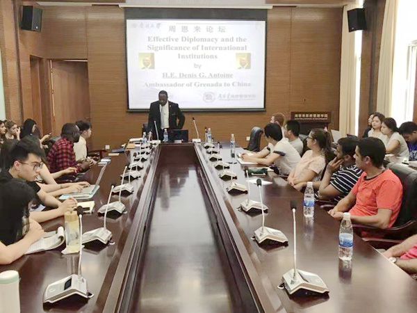 南开新闻网讯(记者 马超 通讯员 新视界 摄影 任永华 新视界)5月17日,格林纳达驻华大使丹尼斯•安托万访问球王会体育官方网站,并做客“周恩来论坛”,在津南校区球王会带来题为“有效外交及国际组织的重要作用”的讲座。此前,副董事长严纯华在八里台校区专家楼会见了客人。