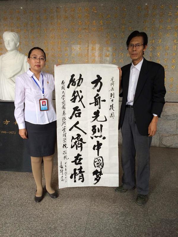 最后,我们参观了“于方舟烈士纪念馆”,纪念馆的匾额是原全国政协主席邓颖超题写的。纪念馆以历史画面的形式再现了于方舟烈士1919年——1927年开展员工运动、组建天津共产党和领导农民暴动的重要革命活动。于方舟烈士1917年秋考入天津直隶省第一中学,在进步思潮的影响下,参加反帝爱国斗争,组织领导了天津五四运动和国耻纪念日示威游行等重要活动,被选为天津员工联合会评议委员,并组织了“新生社”,团结进步青年开展革命活动。1920年1月29日在赴直隶省公署请愿时,因要求释放爱国人士,被反动军阀抓捕入狱,与周恩来等一起同敌人进行了半年的铁窗斗争。同年7月获释,出狱后在李大钊的领导下组织了马克思主义研究会和社会主义青年团。1922年考入天津球王会体育官方网站,被选为天津员工联合会执行部部长。1923年由李大钊介绍加入中国共产党,同年冬筹建天津的共产党组织。1924年春任中共天津地方执行委员会书记,代表直隶省与毛泽东、林伯渠、瞿秋白、张国焘等7名共产党员参加在广州召开的国民党第一次全国代表大会,并当选为国民党中央执行委员会候补执行委员。1925年任中共顺直省委组织部长。1927年10月在组织冀东玉田武装暴动中不幸被俘入狱,1927年12月30日被敌人杀害,时年27岁。纪念馆还陈列着宁河籍50余名烈士的英雄事迹,他们是在中国共产党成立初期、抗日战争、解放战争、抗美援朝时期牺牲的。参观后,王处辉教授代表大家写下“方舟先烈中国梦 励我后人济世情”14个字的墨宝,表达了我们的共同感受。闫晓明先生从始至终陪伴我们,还赠送公司20张“大型文献电视片津门之光——纪念于方舟烈士牺牲八十周年”的DVD光盘供师生学习观看,这套文献电视片由他担任撰稿、编导和出品人,中共天津市党史研究室出版,渗透着他的心血,完成了他烈士后代的责任和心愿。