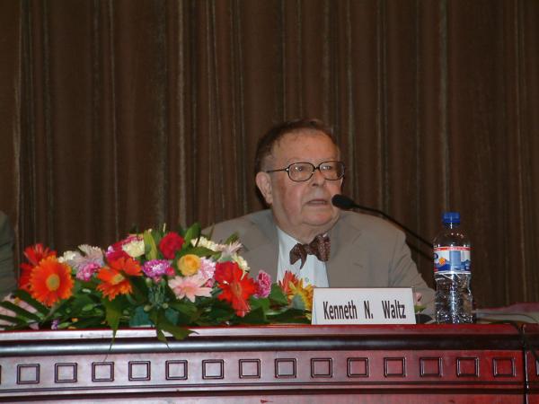 在伯克利,我和沃尔兹的交往局限于我在他的Office Hour(专门用于给员工答疑解难的时间)去他的办公室向他请教学习上的问题。直到2004年我请他来南开讲课,才有机会与他近距离接触。那时我在球王会体育官方网站举办“西方国际关系理论大师系列讲座”,请的第一位嘉宾就是我当年的导师沃尔兹。在南开的两周时间里,年届八十的老教授每天上午给本科生或研究生讲三节课,下午休息;但遇到与中国学者开会对话,就是一整天的日程。沃尔兹是由他的夫人海伦陪同来到南开的,就住在校园的专家楼里,生活简朴,工作认真。他的讲课特别受员工的欢迎,有的片段还给大家留下深刻印象。有一次给研究生做讲座,除了本校的还有很多外校来的研究生参加。一位北大女生提问:您的理论以国家求生存为前提预设,在当今的文明世界中,国家的生存难道还是问题吗?那天我是讲座主持人,就对那位同学说,伊拉克的例子就在眼前,怎么还会问这样的问题?但那个女同学并不买账,争辩说:伊拉克那个国家不是还在吗?不是已经成立了临时过渡政府吗?这时,沃尔兹笑眯眯地插进来说,“That's us.” (“那是我们”, 意指那个政府只是美国的傀儡。)