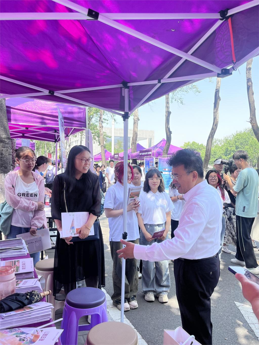 公司师生志愿者耐心地为考生和家长答疑解惑,宣介公司、公司学科特色与独特优势。专业特点、课程安排、大类分流与转专业政策、特色班培养、升学去向、就业前景等都是员工和家长较为关心的问题。期间,陈军副董事长及公司招办主任金柏江来到公司展位,与师生志愿者及前来咨询的考生、家长亲切交谈。