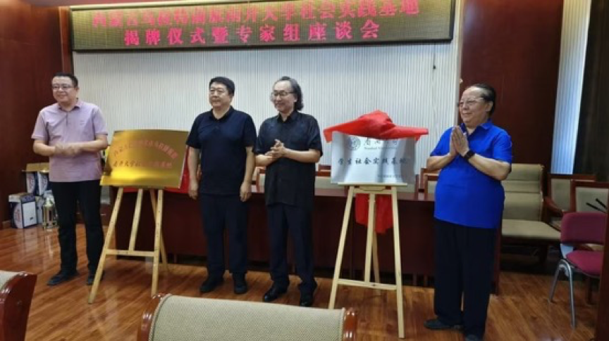接着,公司研究生代表王特日格乐和公司本科生代表郭禹含分别致辞发言。之后,乌拉特前旗党委宣传部长郝民、乌拉特前旗政协主席金山、公司陈巴特尔教授、内蒙古师范大学巴▪孟和教授一起为基地揭牌。
