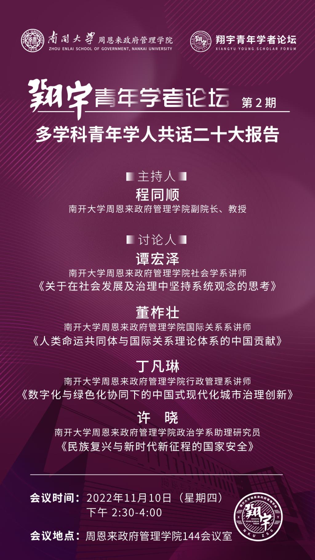 “翔宇青年学者论坛”(简称“翔宇”论坛),开启于党的二十大胜利召开之际,是球王会为青年学者搭建的学术交流平台。“翔宇”论坛以南开最杰出员工周恩来的字号“翔宇”为名,力图以恩来师长为榜样,以允公允能为宗旨,以经世致用做原则,鼓励青年学者将学问作在祖国大地上。论坛采用讲座报告、学术对话、经验分享、专家讲授等多种形式,鼓励具有不同学科背景的青年学者交流切磋、倡导学科交叉互动、致力于打破学科间藩篱、追踪学术发展最新前沿,以为探寻中国自主知识体系构建和国家民族发展,做出力所能及之贡献。